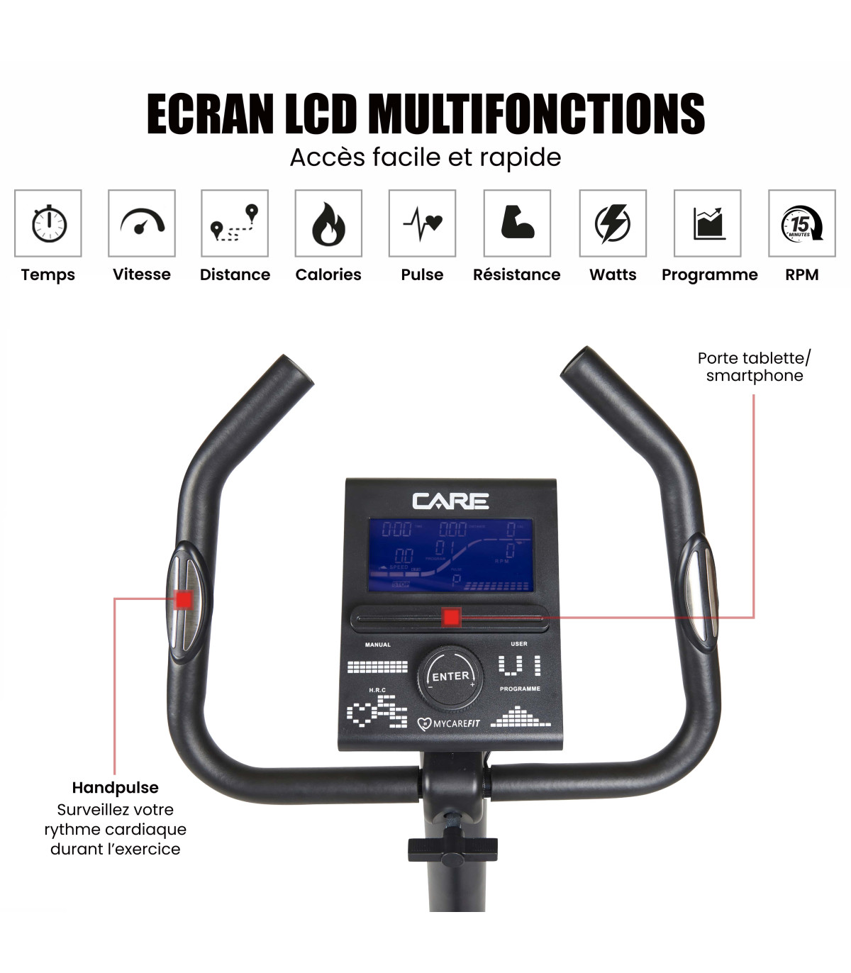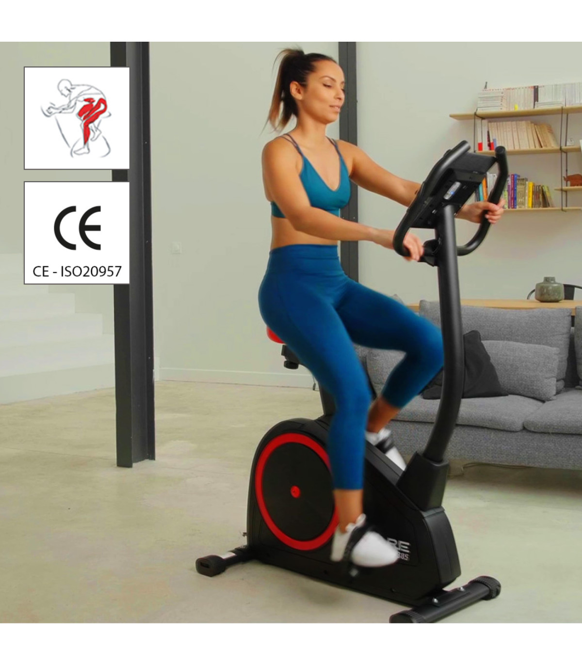 Das CV-385 Fahrrad ist mit einer Konsole mit 9 integrierten Funktionen ausgestattet, Programme sind in wenigen Sekunden zugänglich und es ist kompatibel mit der KINOMAP App für die Verfolgung Ihrer Leistung.