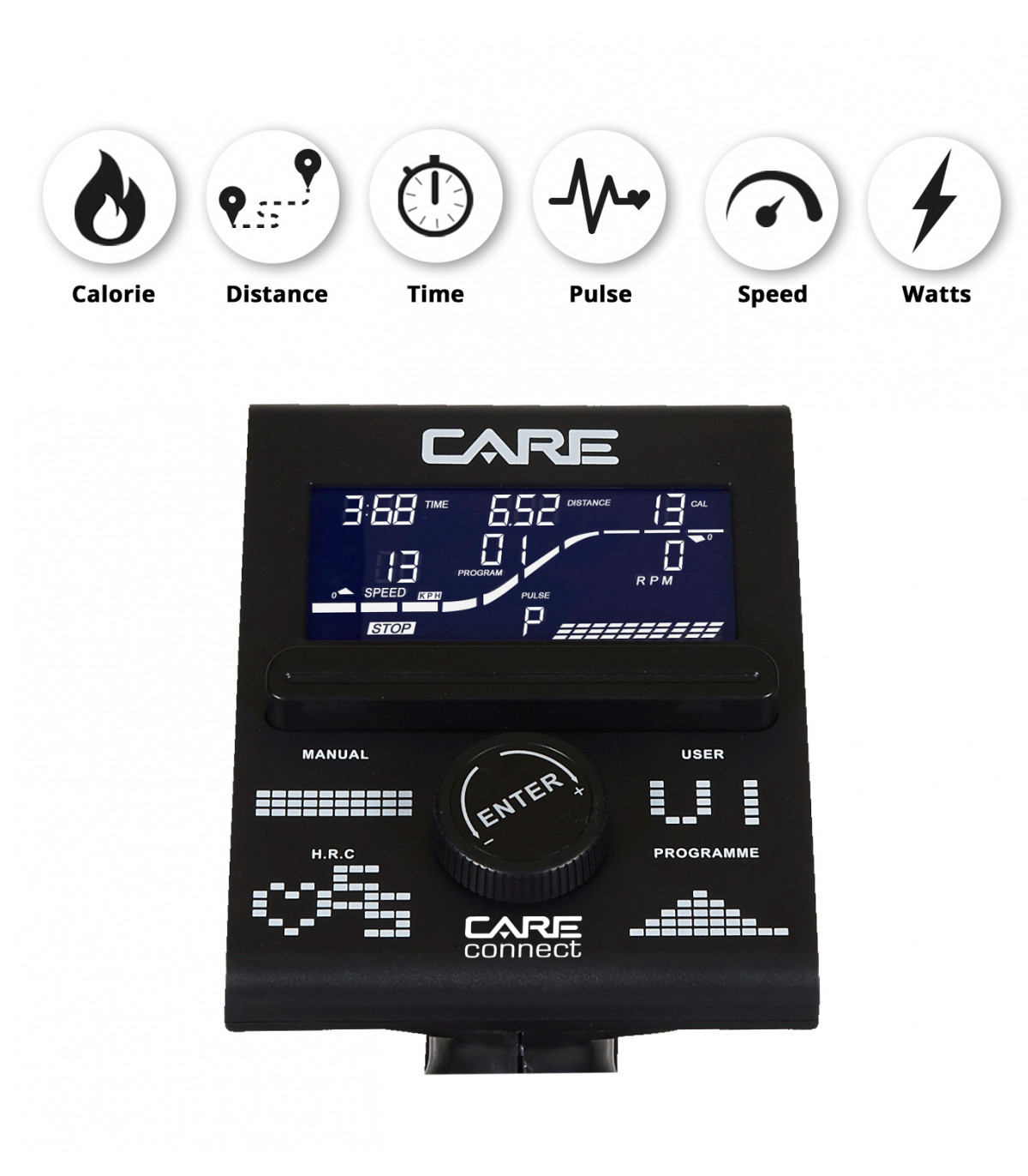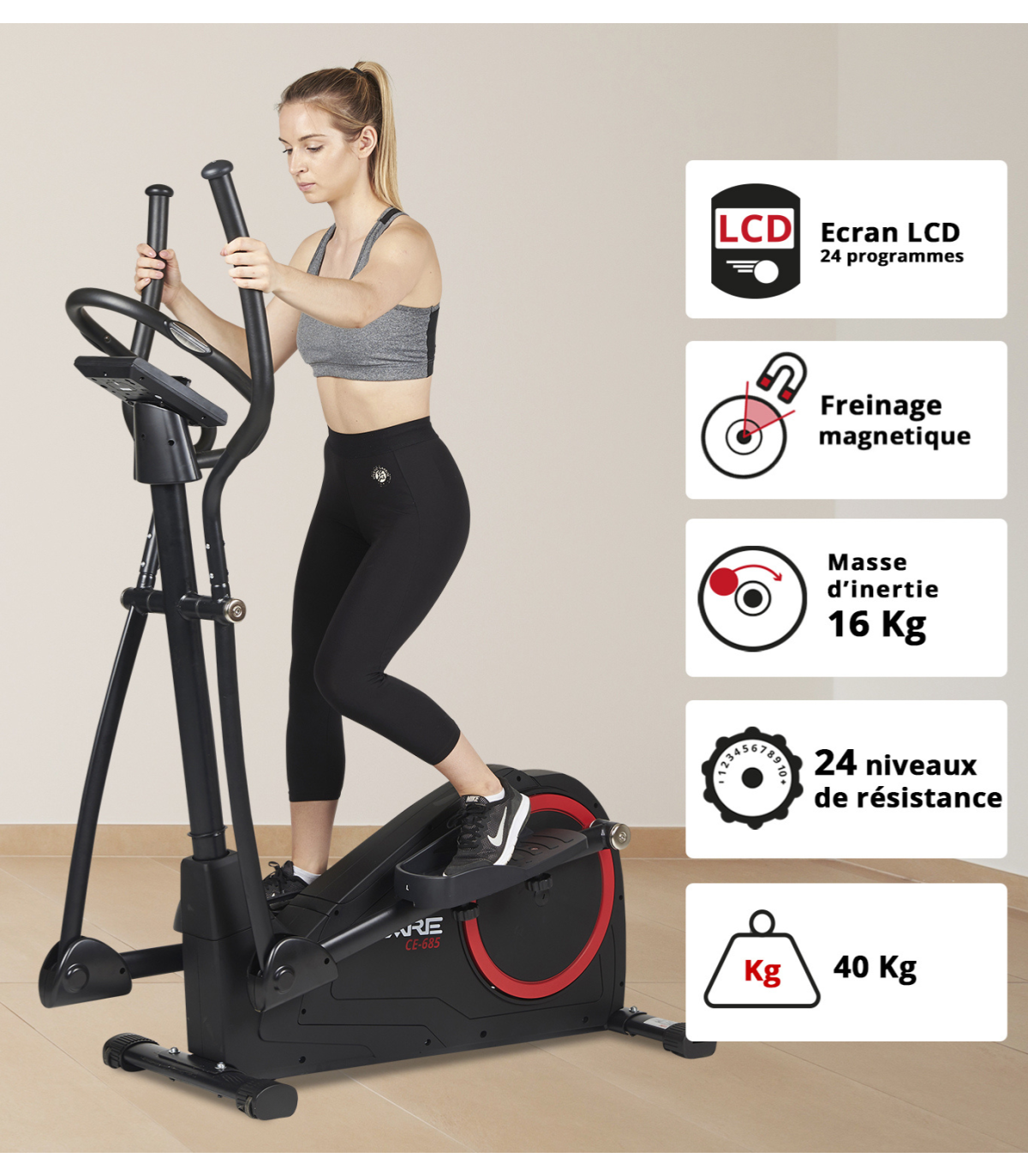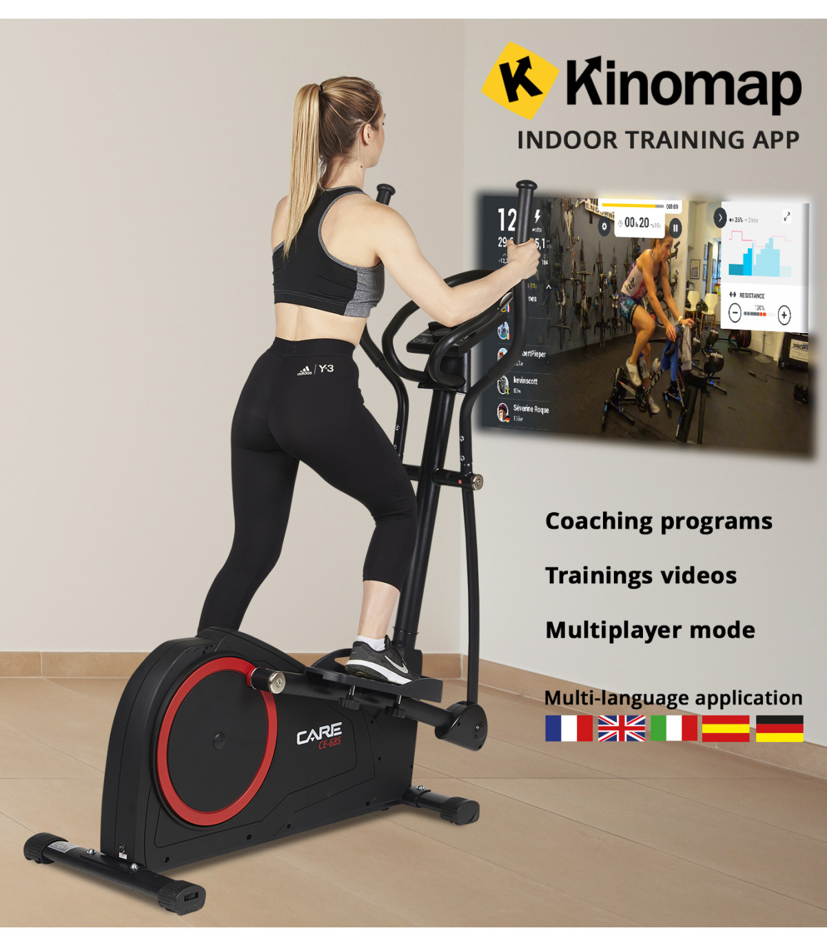 Computer: Der CE-685 ist mit einer Konsole mit 10 Funktionen ausgestattet, schnell zugänglichen Programmen und ist kompatibel mit der KINOMAP Coaching-App, die es Ihnen ermöglicht, Ihre Leistungen zu verfolgen und ein personalisiertes und progressives Training bietet.