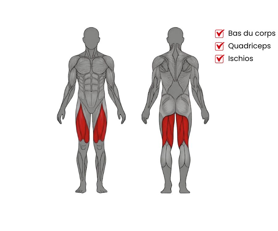 Das Hauptziel dieser Doppeleinheit ist die massive Entwicklung der vorderen und hinteren Beinmuskelkette. Im Leg Extension-Modus konzentriert sich die Belastung auf den Quadrizeps, einschließlich des Vastus medialis und des Vastus lateralis, um die Kniekontur zu definieren. Beim Wechsel zur Leg Curl-Funktion richtet sich die Muskelrekrutierung auf die ischiokruralen Muskeln, insbesondere den Semitendinosus und den Semimembranosus, die für das muskuläre Gleichgewicht und die Verletzungsprävention unerlässlich sind. Die geführte Isolationsübung ermöglicht es, Muskelversagen sicher zu erreichen, ohne die Lendenwirbelsäule zu belasten. Seine Vielseitigkeit macht ihn zu einem idealen Werkzeug für Intensitätsmethoden wie den antagonistischen Supersatz. Die Biomechanik respektiert die natürliche Rotationsbewegung des Gelenks und bietet eine vollständige Amplitude für eine maximale Dehnung der Fasern.