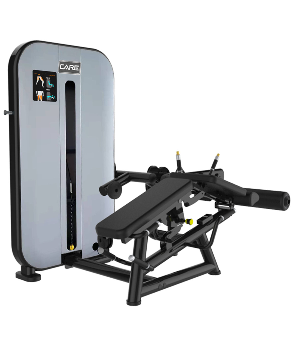 Der Wechsel erfolgt durch einen einfachen gelben Steckbolzen, mit dem der Hebelarmswinkel und die Rückenlehnenposition angepasst werden können, um sofort zwischen Quadrizeps und Ischiokrurale Muskeln zu wechseln.