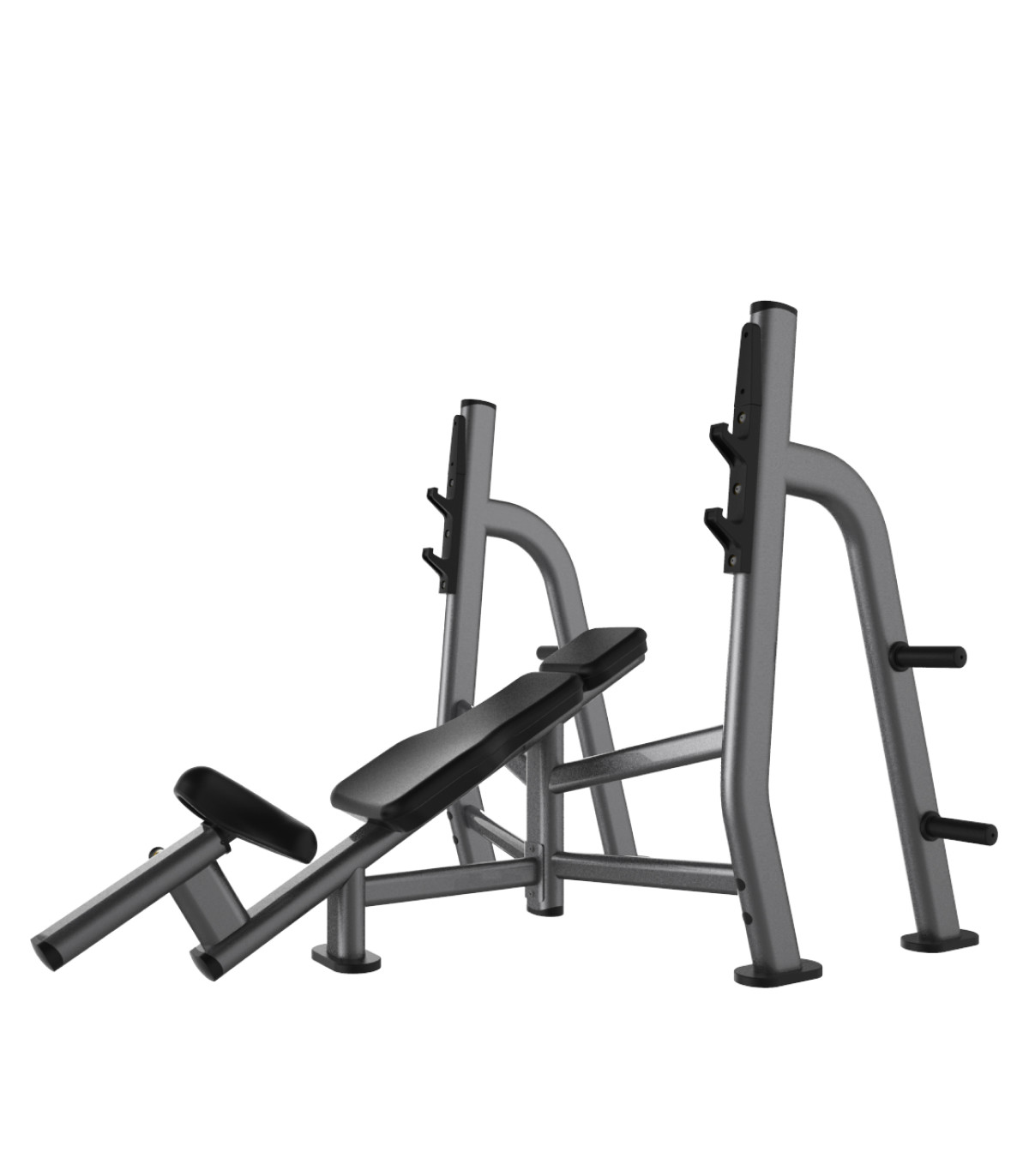 Diese geneigte Olympiabank zeichnet sich durch eine robuste Struktur aus, die für die Aufnahme schwerer Lasten beim intensiven Training der Brustmuskeln konzipiert ist. Mit einem Gewicht von 75 kg gewährleistet dieses verstärkte Stahlchassis eine makellose Stabilität für athletische Kraftübungen. Die großzügigen Abmessungen von 201 cm x 161 cm x 141 cm Höhe bieten eine sichere Arbeitsplattform für eine vollständige Bewegungsamplitude. Die feste Neigung der Rückenlehne ermöglicht eine präzise Ausrichtung auf den oberen Anteil des großen Brustmuskels, während gleichzeitig die vorderen Deltamuskeln beansprucht werden. Das Design integriert zwei Ebenen von Stangenablagen mit hochdichtem Kunststoffschutz, um die Olympiastange zu schonen und die Geräuschentwicklung beim Einrasten am Ende einer Serie zu minimieren. Vier Aufbewahrungsdorne für Gusseisenscheiben sind geschickt integriert, um den Zugang zu den Gewichten zu erleichtern, ohne den Arbeitsbereich zu überladen.