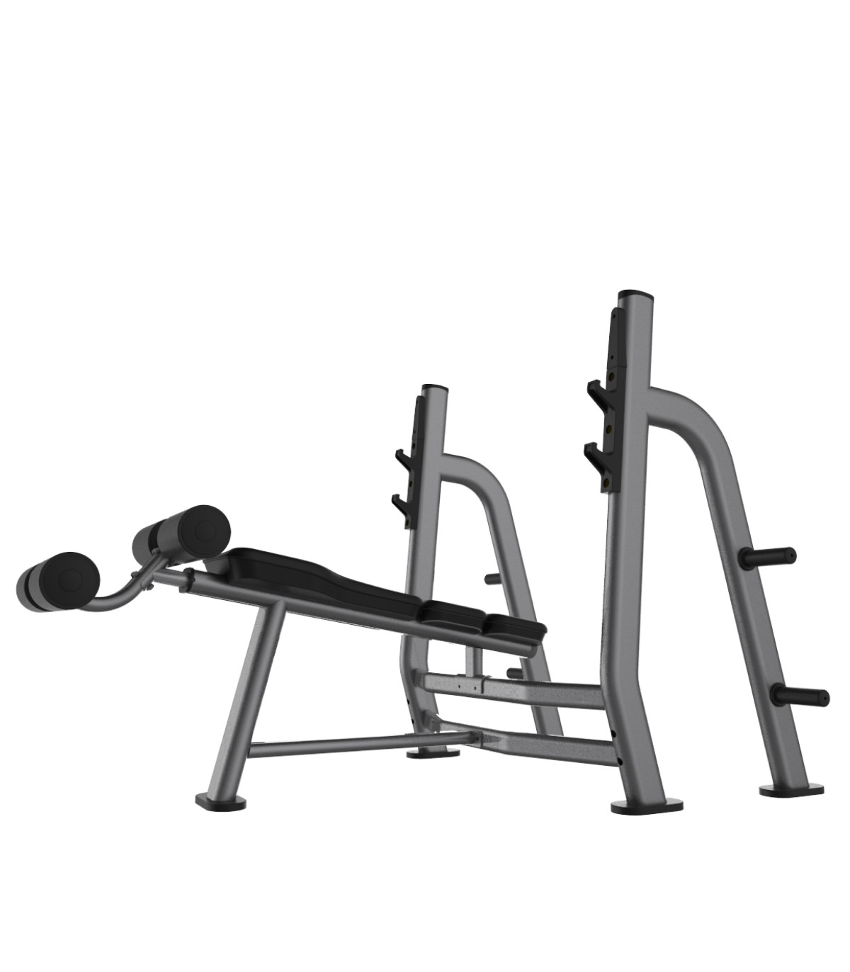 Dieser auf Kraft ausgerichtete Arbeitsplatz verfügt über einen robusten Rahmen, der für die Stabilisierung der schwersten Druckbewegungen ausgelegt ist. Mit einem Gewicht von 78 kg bietet die Struktur einen sicheren Halt für Übungen mit freien Gewichten unter Verwendung einer olympischen Hantelstange. Die Abmessungen von 142 cm x 138 cm x 135 cm Höhe ermöglichen eine optimierte Standfläche und gewährleisten gleichzeitig volle Bewegungsfreiheit für den Sicherungspartner. Das Design umfasst zwei Ebenen von Stangenablagen mit hochfesten Kunststoffschutzvorrichtungen, um die Rändelung Ihrer Stangen zu schonen und die Geräuschentwicklung zu reduzieren. Die spezifische Negativneigung der Bank ist darauf ausgelegt, die muskuläre Verbindung im unteren Bereich des großen Brustmuskels zu maximieren. Diese Einheit hält intensiven Belastungen dank ihres verstärkten Stahls und seiner dauerhaften Epoxidlackierung stand.