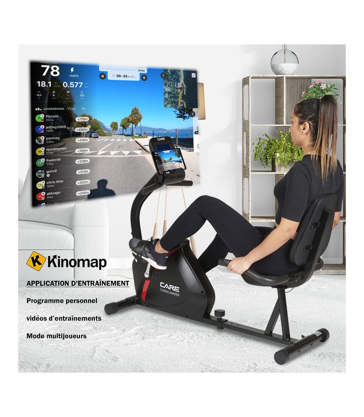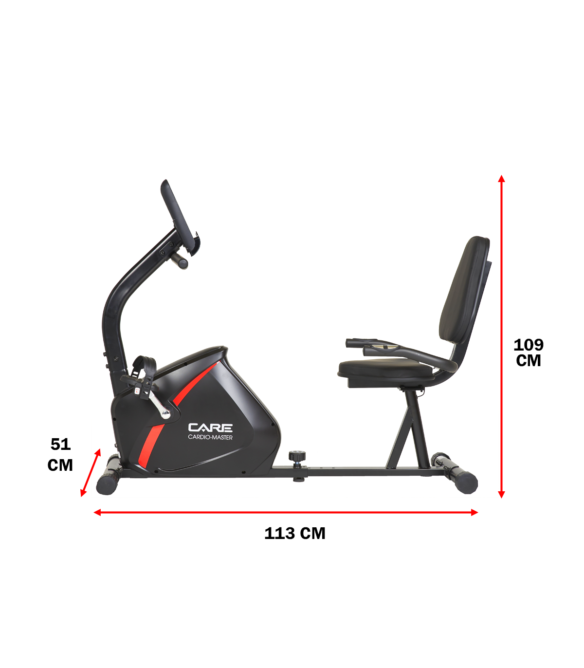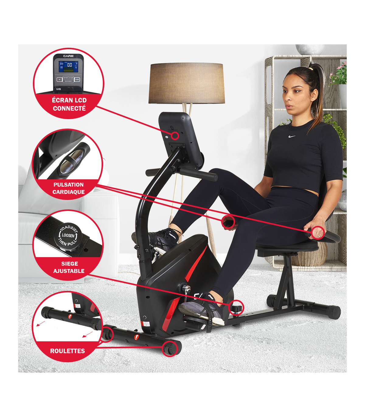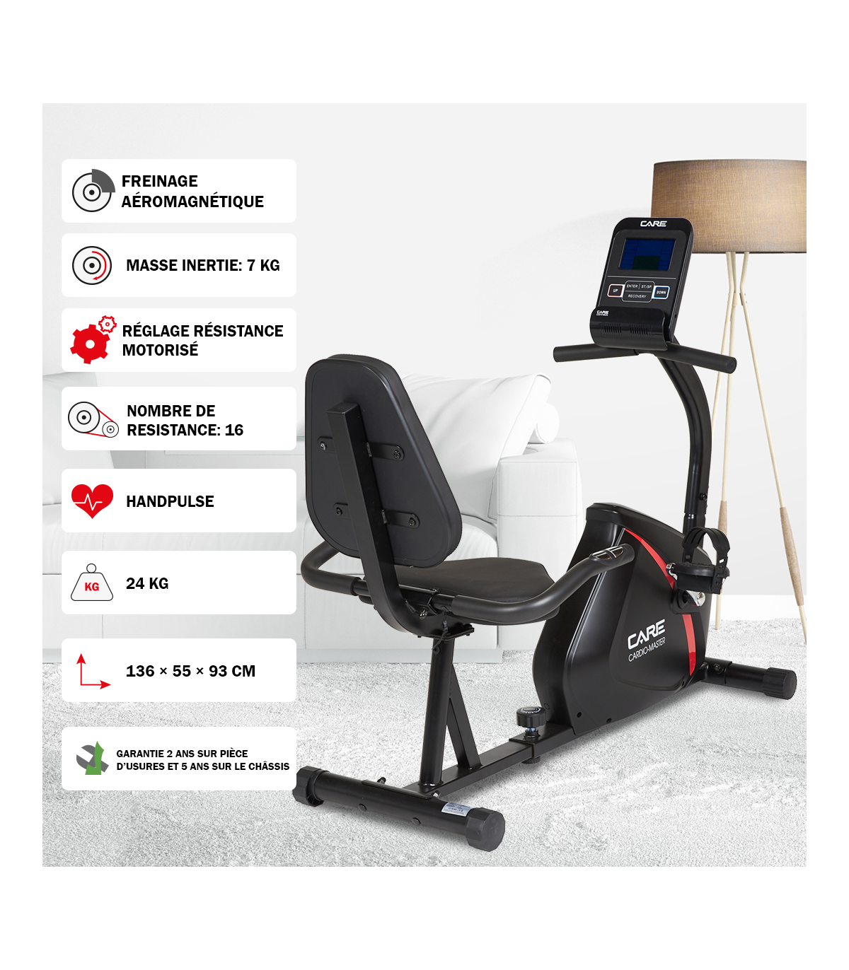 Dieses halbliegende Fahrrad eignet sich sowohl für Cardio-Training als auch für Rehabilitation. Mit seiner Schwungmasse bietet es hohen Tretkomfort, kombiniert mit einem elektronisch verstellbaren elektromagnetischen Widerstandssystem mit 16 Stufen und einem Computer mit 20 Funktionen.