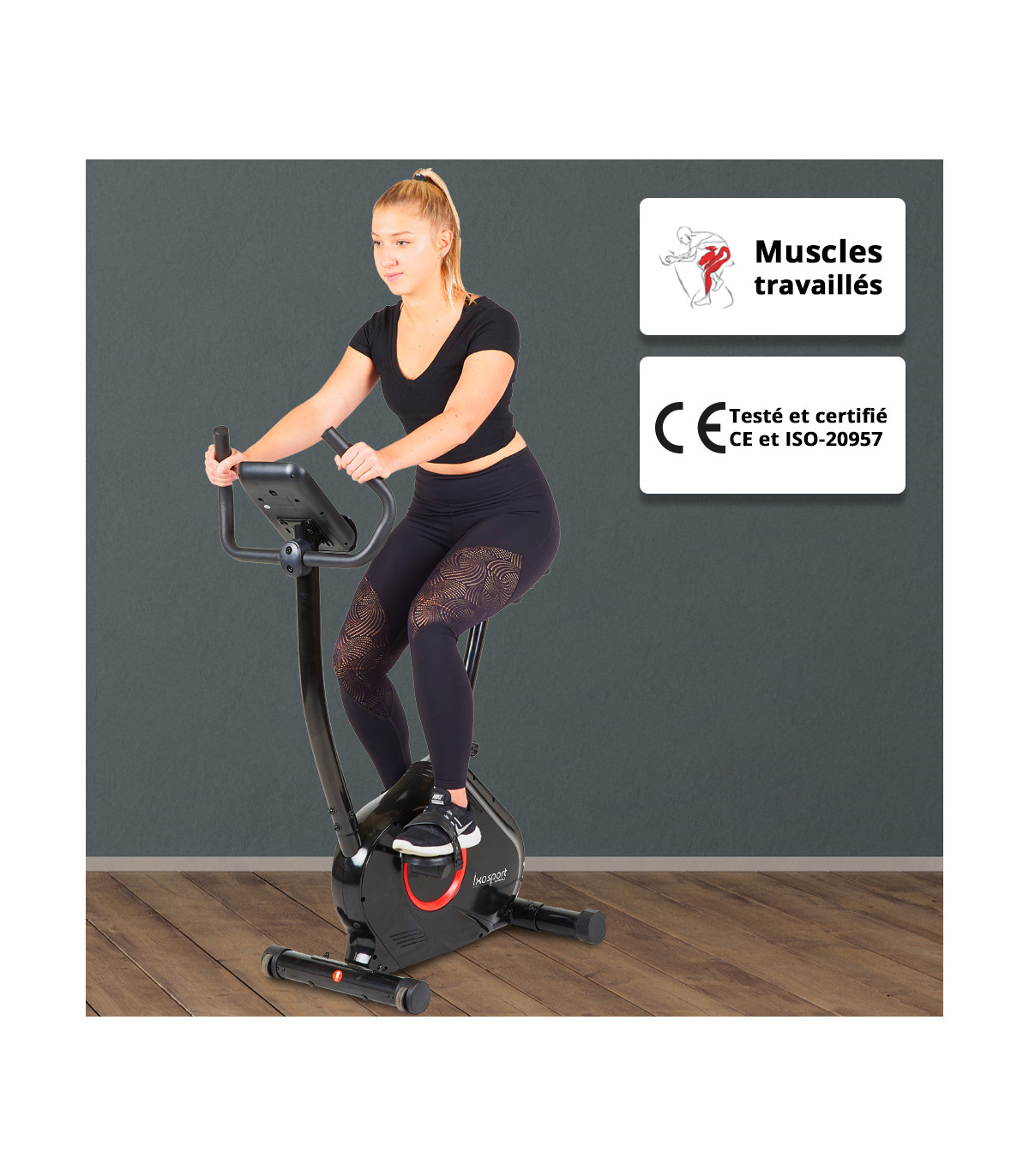 Sehr umfangreich ausgestattetes Heimtrainer-Fahrrad mit 16-stufigem magnetischem Widerstandssystem, 16 Trainingsprogrammen, Handpuls-Sensoren zur Herzfrequenzmessung und Riemenantrieb.